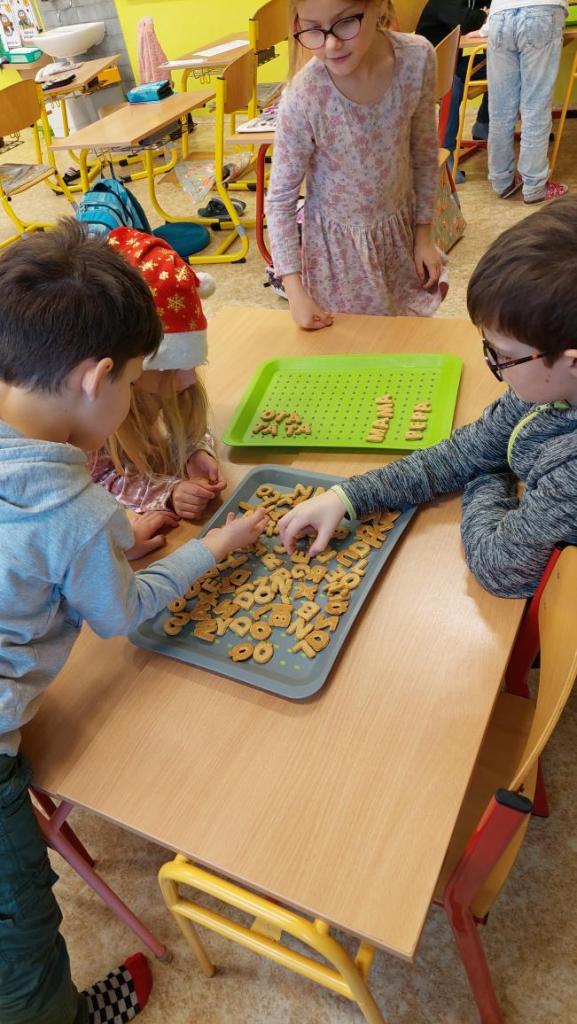 Podle pokynů spolužáků z druhého ročníku prvňáčci skládali sušenková písmena do slov.